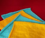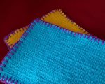 - Met geel 45 steken opzetten. Daarna 19 cm tricotsteek breien. Afkanten.