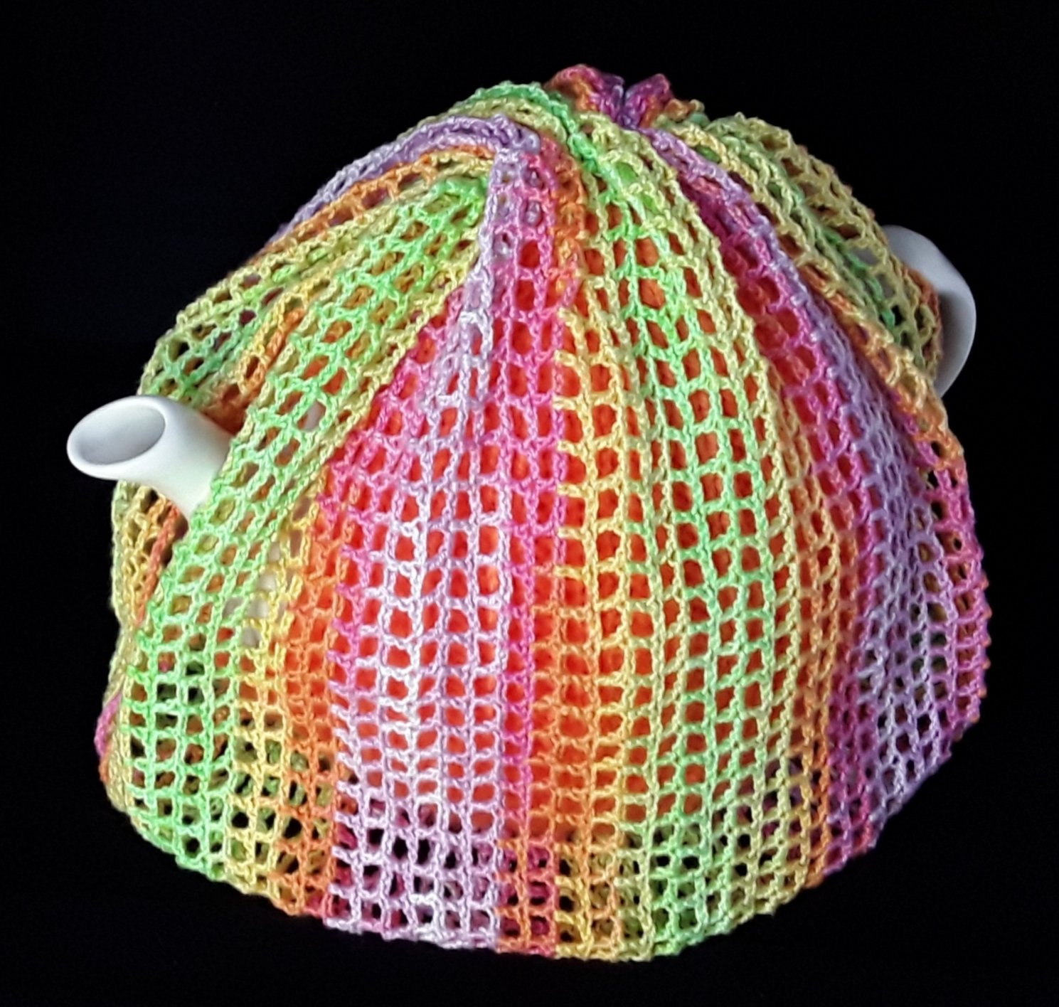 Vrolijke (bijna) lente muts in gezellige ijsjes kleuren. De binnenmuts onder het net houdt de thee lekker heet!