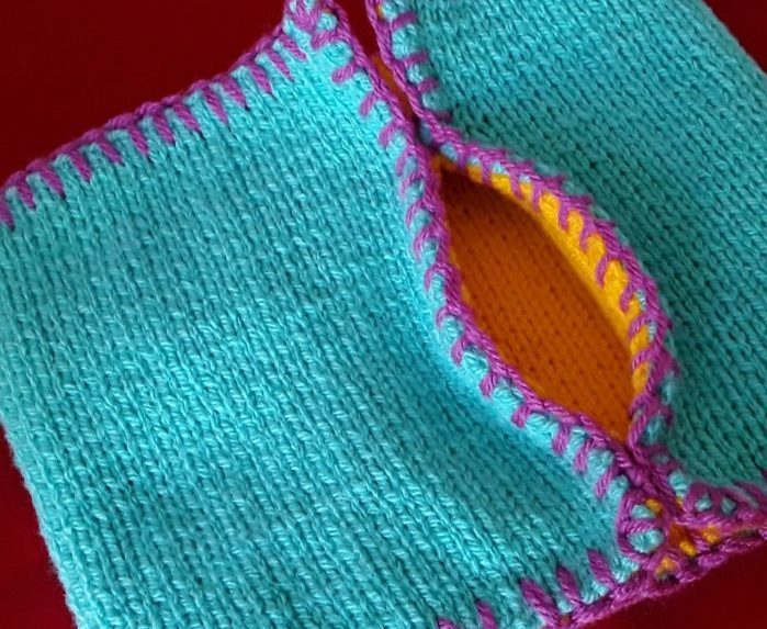 - Met geel 45 steken opzetten. Daarna 19 cm tricotsteek breien. Afkanten.
